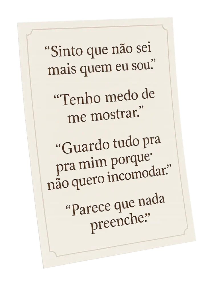 “Sinto que não sei mais quem eu sou.” “Tenho medo de me mostrar.” “Guardo tudo pra mim porque não quero incomodar.” “Parece que nada preenche.”